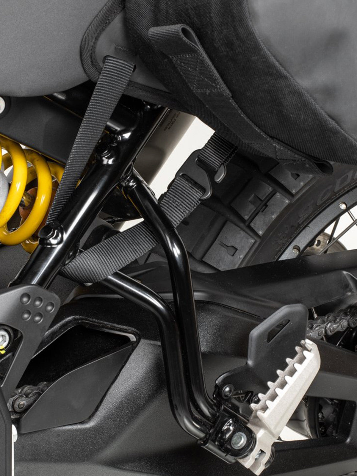 Designed to be a perfect fit on the DUCATI DESERT-X with a custom shape and specific fitting hardware. The OS-BASE is an 'over the seat harness' for mounting OS-6, OS-12, or OS-18 ADVENTURE PACKS as soft panniers, with no need for metal frames. This system provides a super-tough, lightweight carrying solution, with no bodywork alterations needed. The fitting hardware gives the flexibility to mount a one, two, or three-pack set-up, depending on your type of ride. The set-length straps make mounting quick and easy, and the custom shape provides a tight, secure fit with plenty of distance from the exhaust. The New X-STRAPS provide extra pack stability for heavy loads or extreme off-road riding. It takes less than a minute to mount and just seconds to remove it.