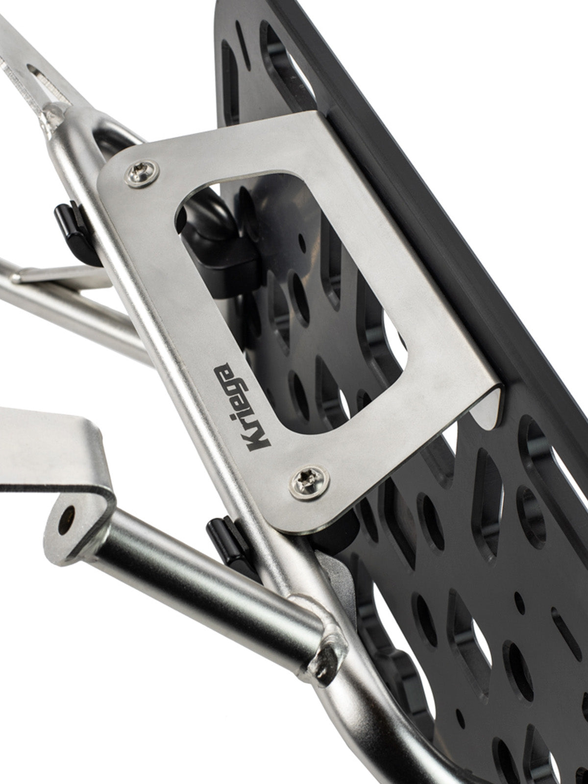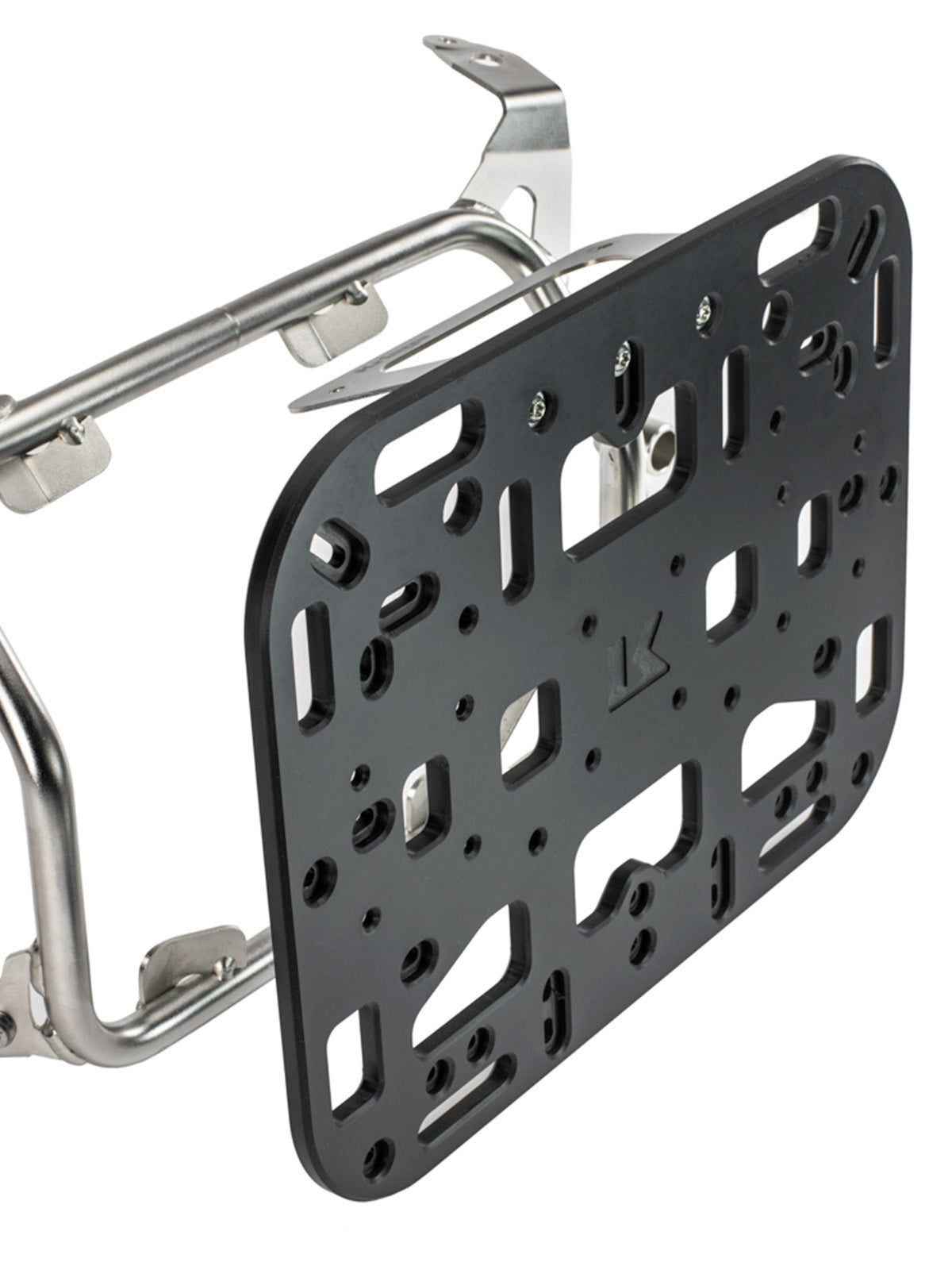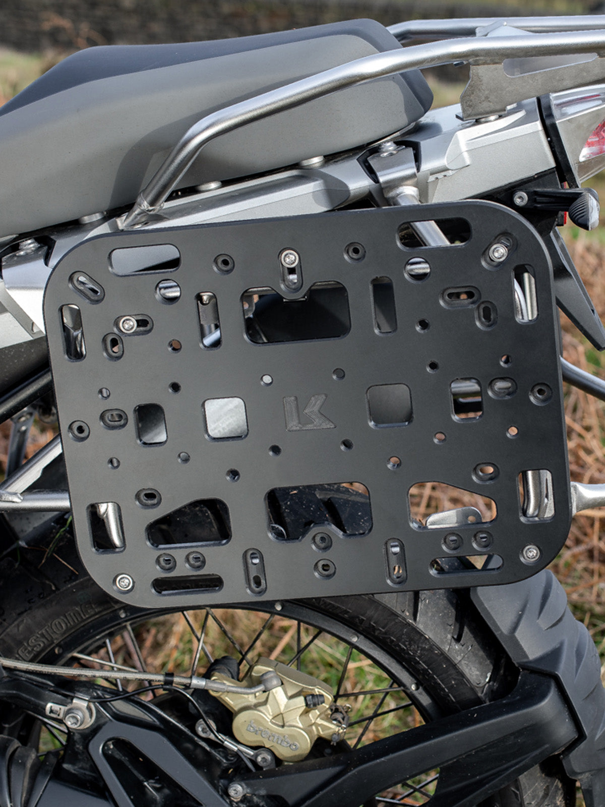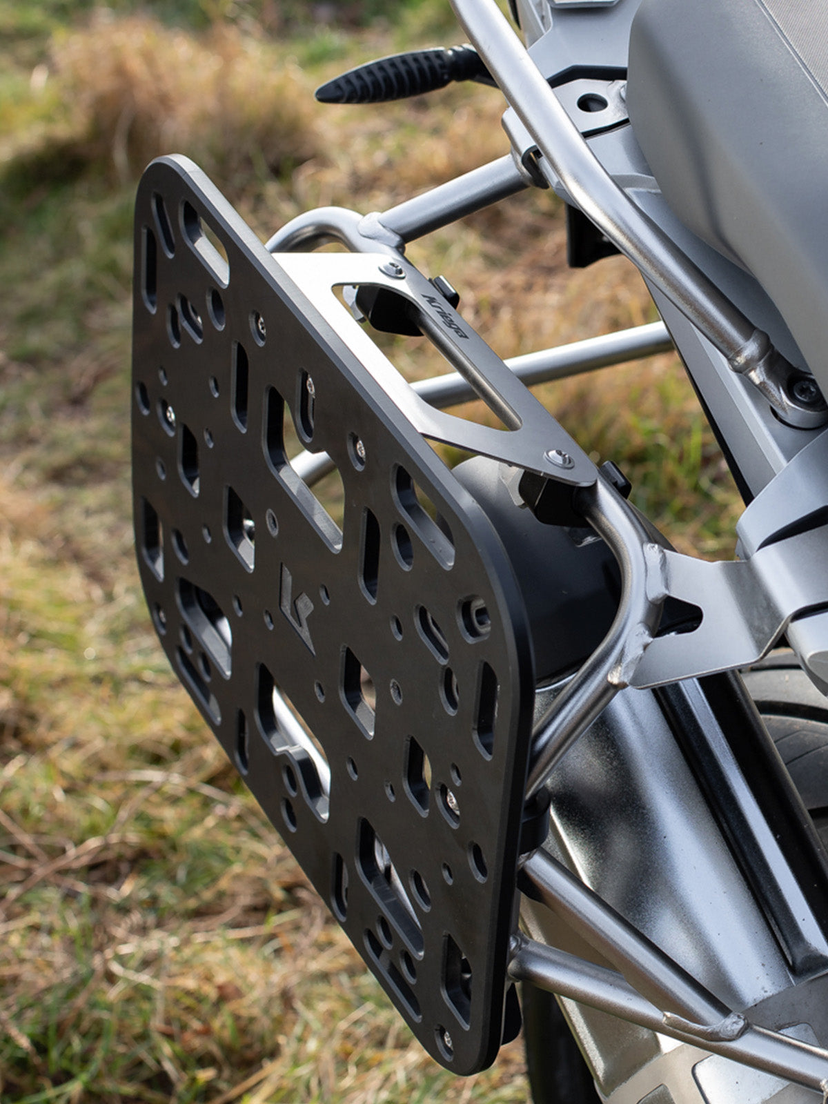 The OS-PANNIERS mount onto a specially engineered OS-PLATFORM which is permanently clamped direct to the GSA frames. Mounting and dismounting of the soft panniers takes less than a minute with two quick release straps and buckles. The same straps compress the pack firmly in position. No extra tie-down straps are required.